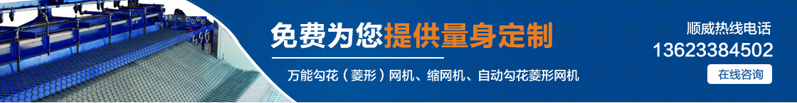 | 安平縣順威絲網機械設備制造有限公司自產自銷,省去中間環(huán)節(jié),讓利給客戶,真正的讓您省錢。主要產品有:萬能勾花(菱形)網機、縮網機、自動勾花菱形網機、全自動勾花菱形網機。 |